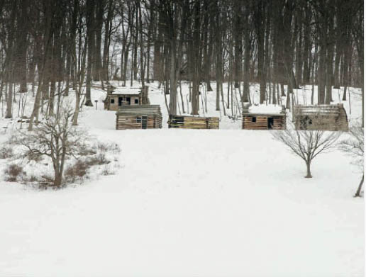At first, the soldiers had to endure this weather in tents while they constructed a veritable city of log huts. Building the cabins went on amid these conditions, with shoeless men clearing hundreds of acres of forest, finding minimal relief from bonfires.
